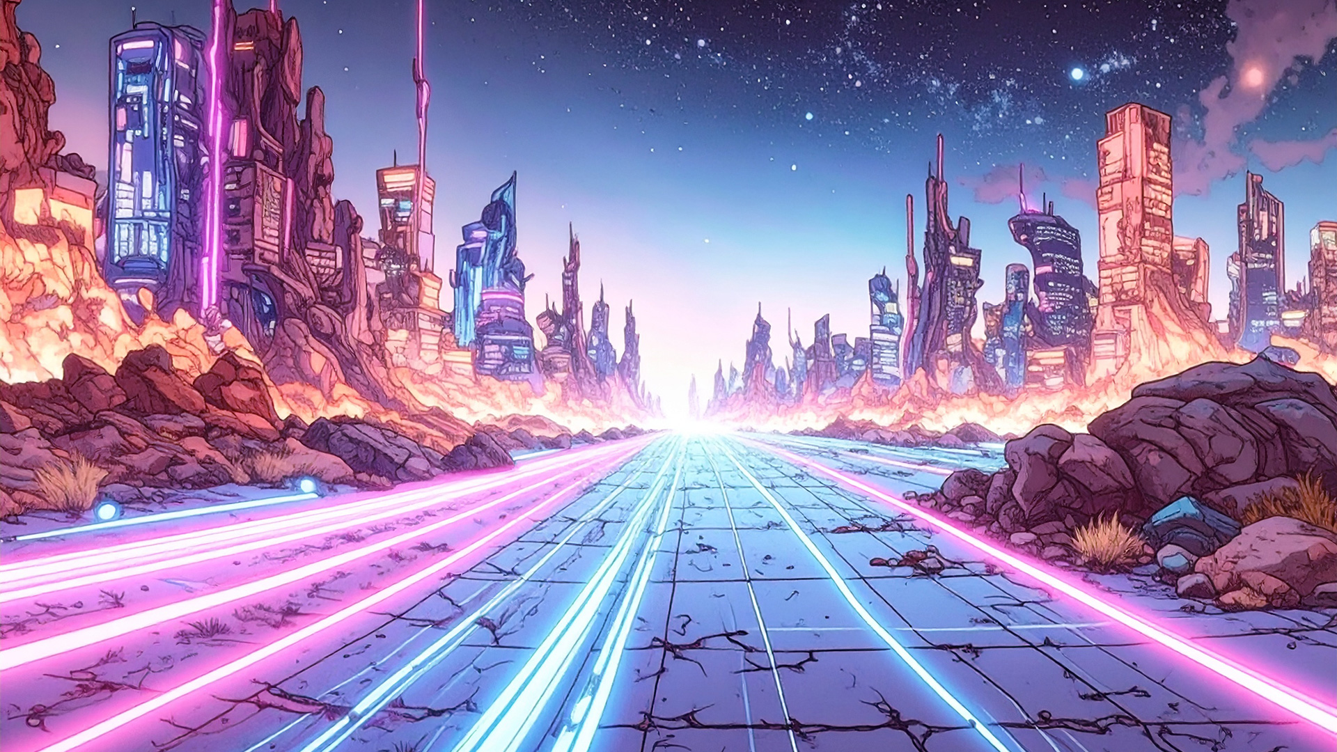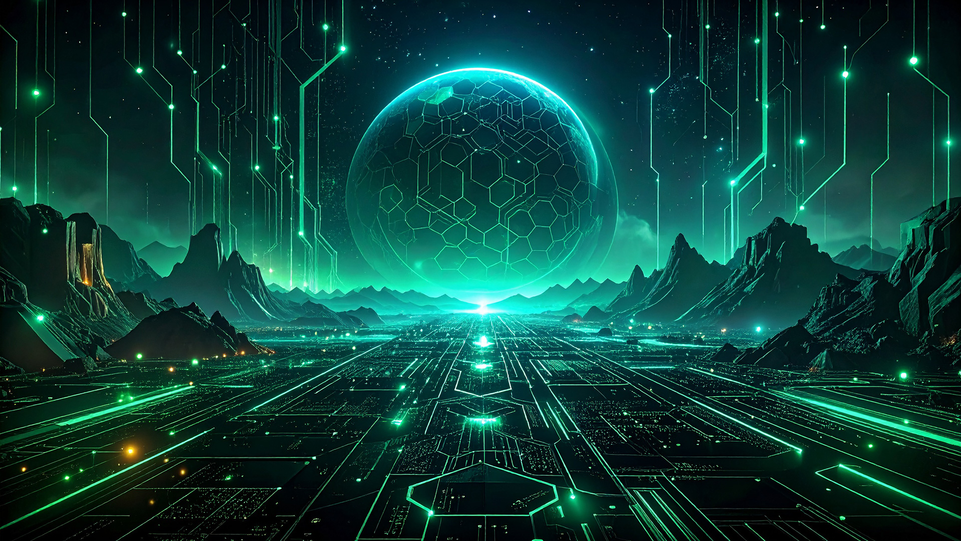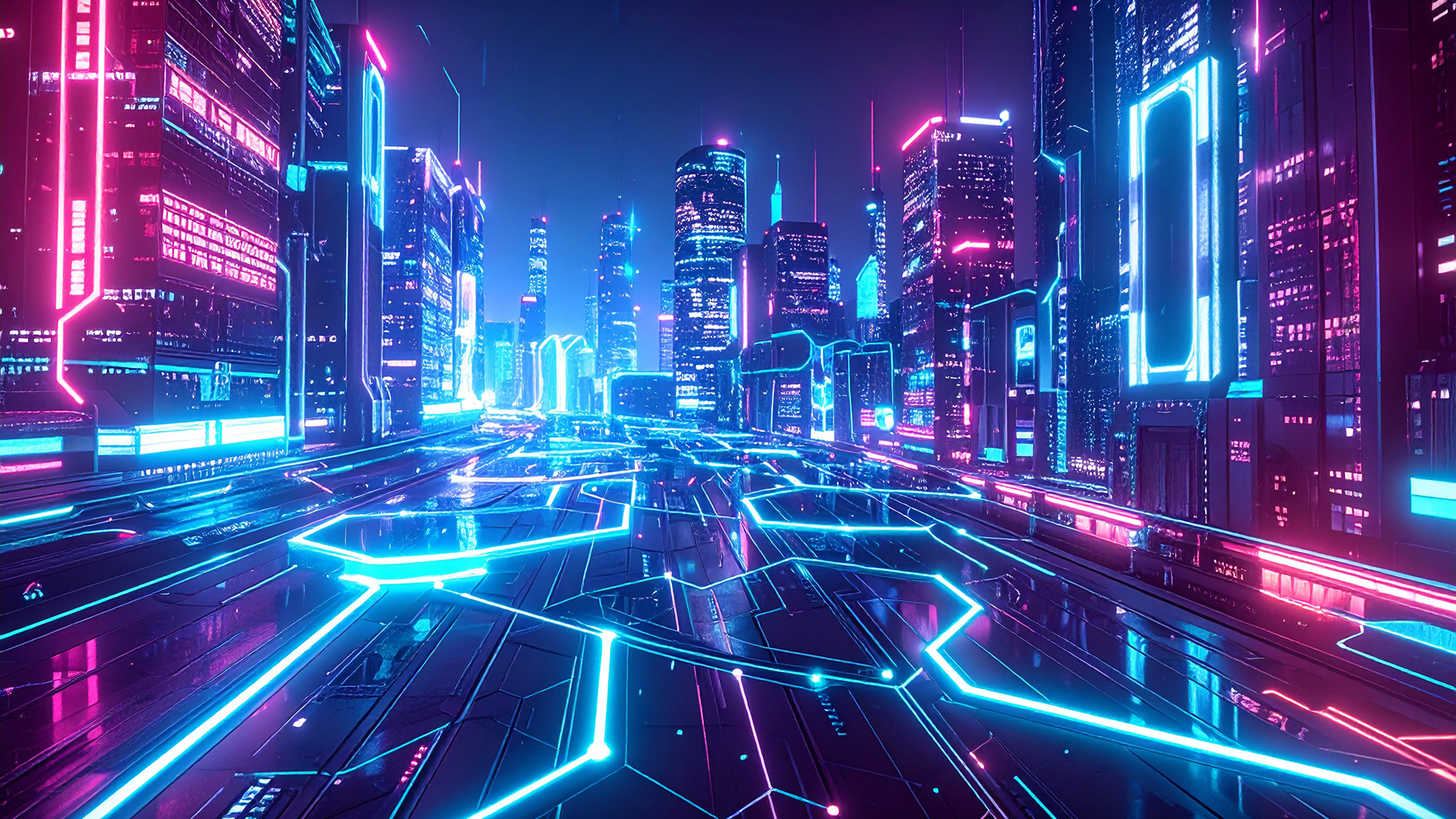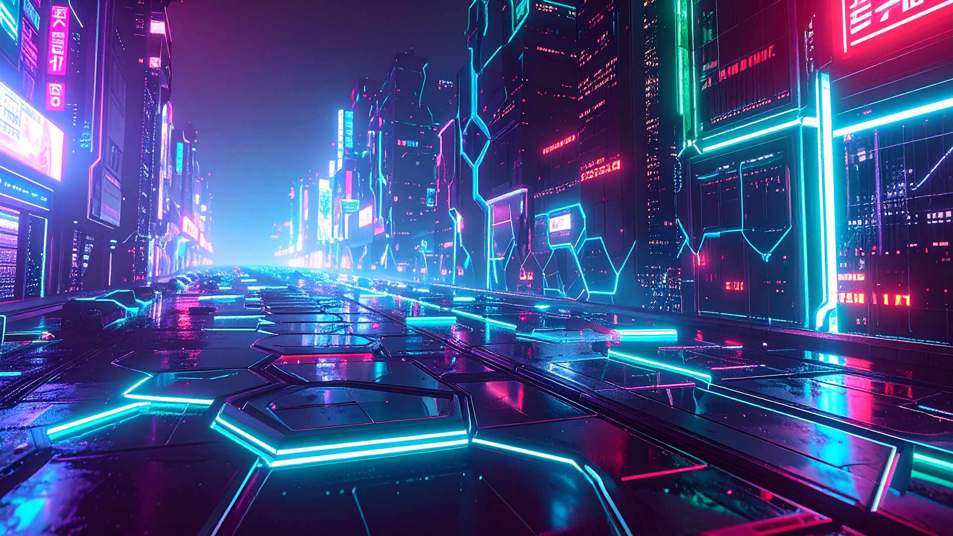 鮮やかなグリーンの光が網の目のように広がる、圧倒的な没入感の近未来都市を描いたイラストです。サイバーパンクな世界観を1920×1080ピクセルのフルHDサイズで表現しました。基盤のようなラインが走る地面と高層ビル群が、高度に発達したデジタル空間を演出。高画質でキレイなこのフリーイメージは、SF作品のバックグラウンドや最新技術を紹介するサイトのメインビジュアルに最適です。商用OK・登録不要で今すぐダウンロードして、あなたのデザインをかっこいい近未来仕様にアップグレードしましょう。