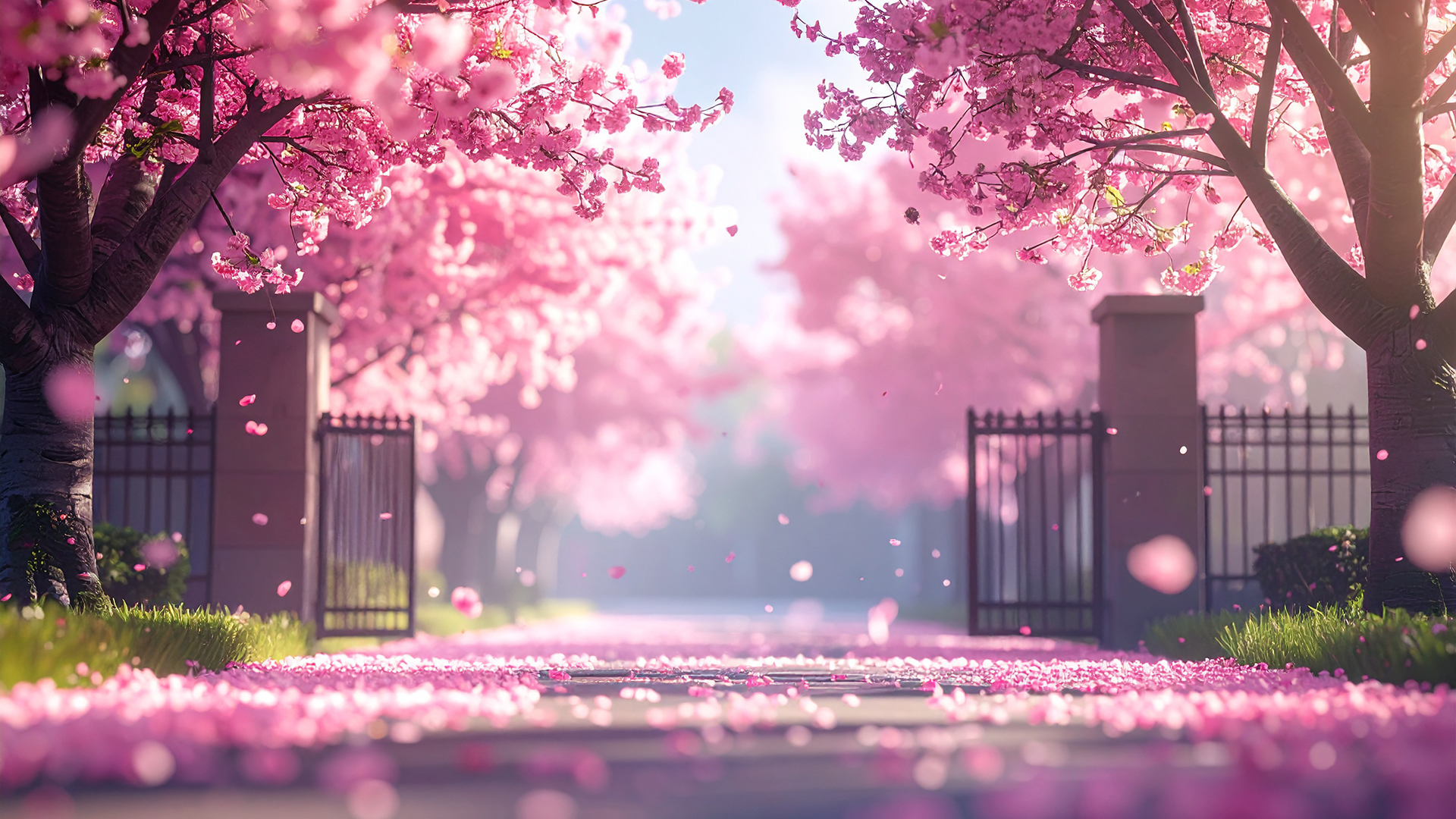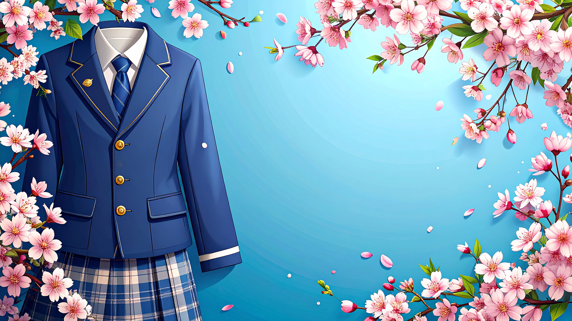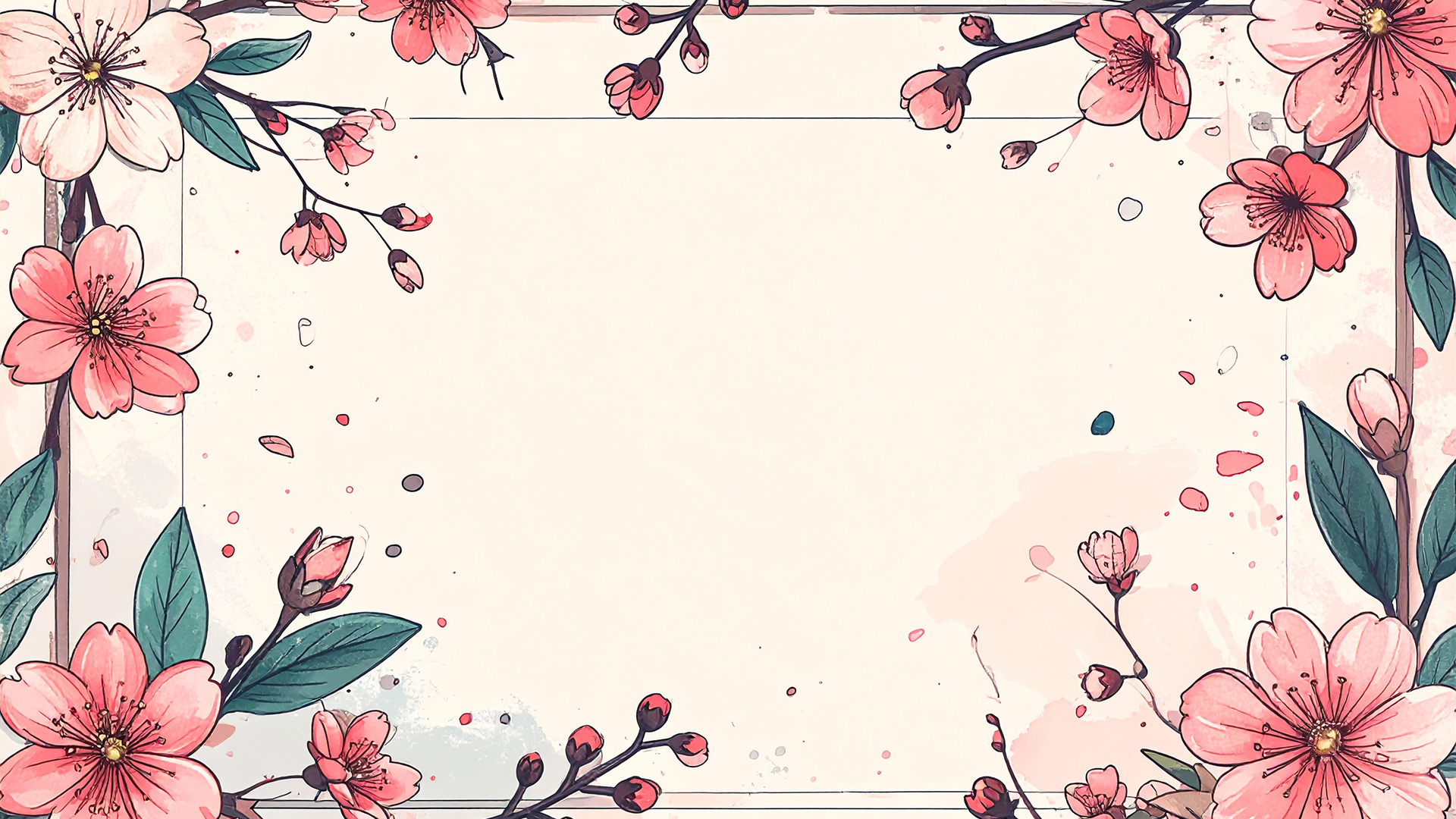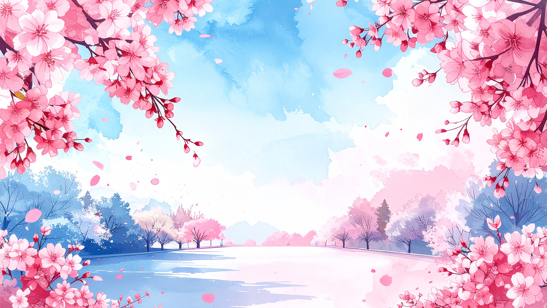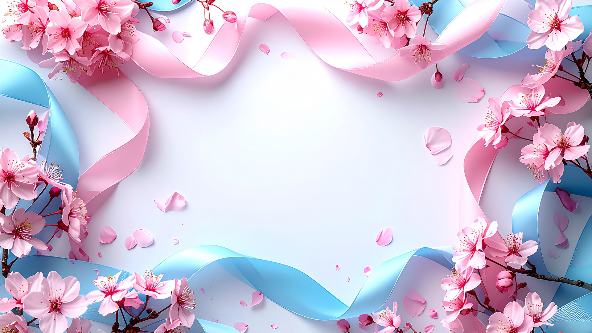 春の訪れを感じさせる、満開の桜と舞い散る花びらをデザインした美しい背景イラストです。画面の上部からしだれるように咲く桜の枝と、下部にふんわりと敷き詰められたピンク色の花びらが、華やかで希望に満ちた雰囲気を演出します。中央部分には広々とした余白が設けられており、文字や写真の配置が簡単に行えるシンプルかつスタイリッシュな構図となっています。1,920 x 1,080サイズの高解像度画像なので、デザイン制作やサイト制作など、幅広いシーンで美しく映える無料素材としてダウンロードいただけます。