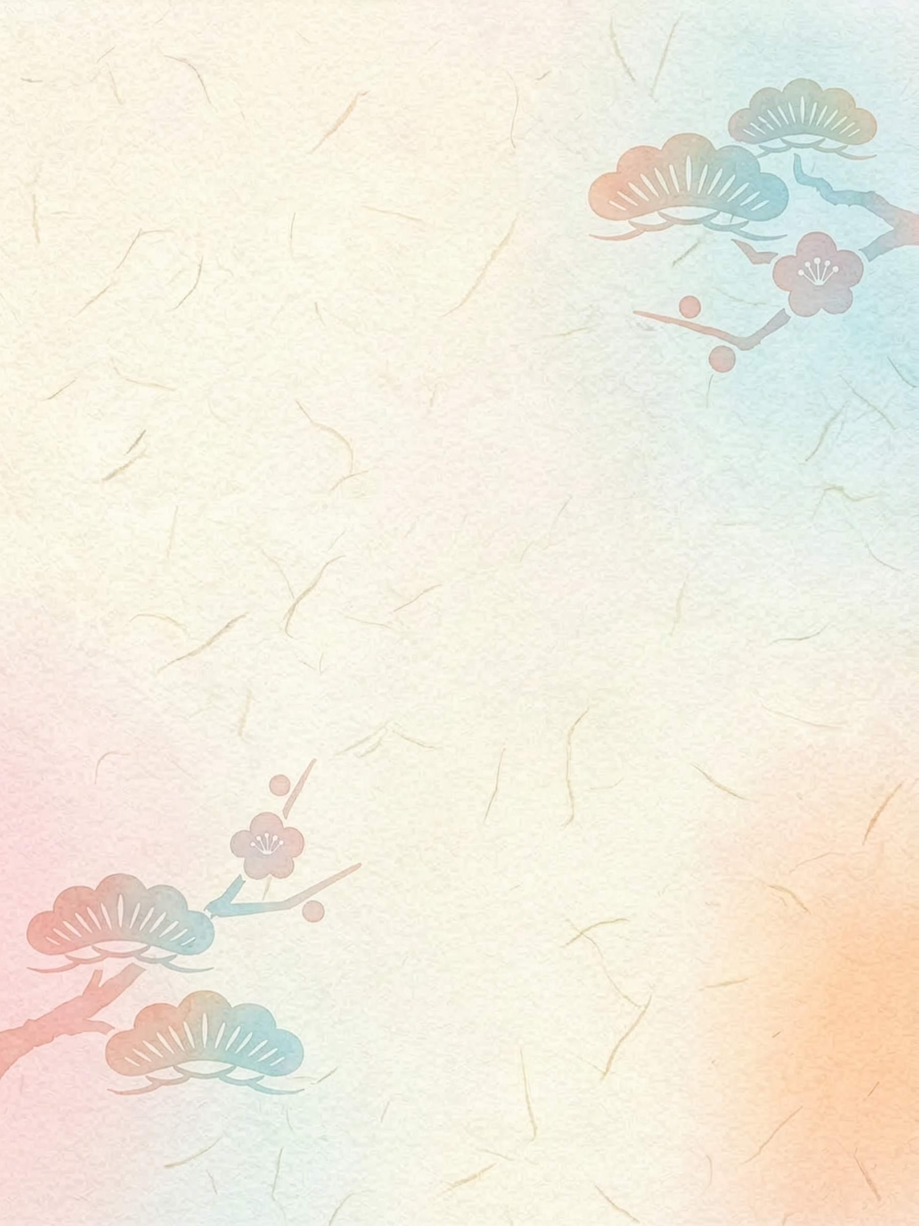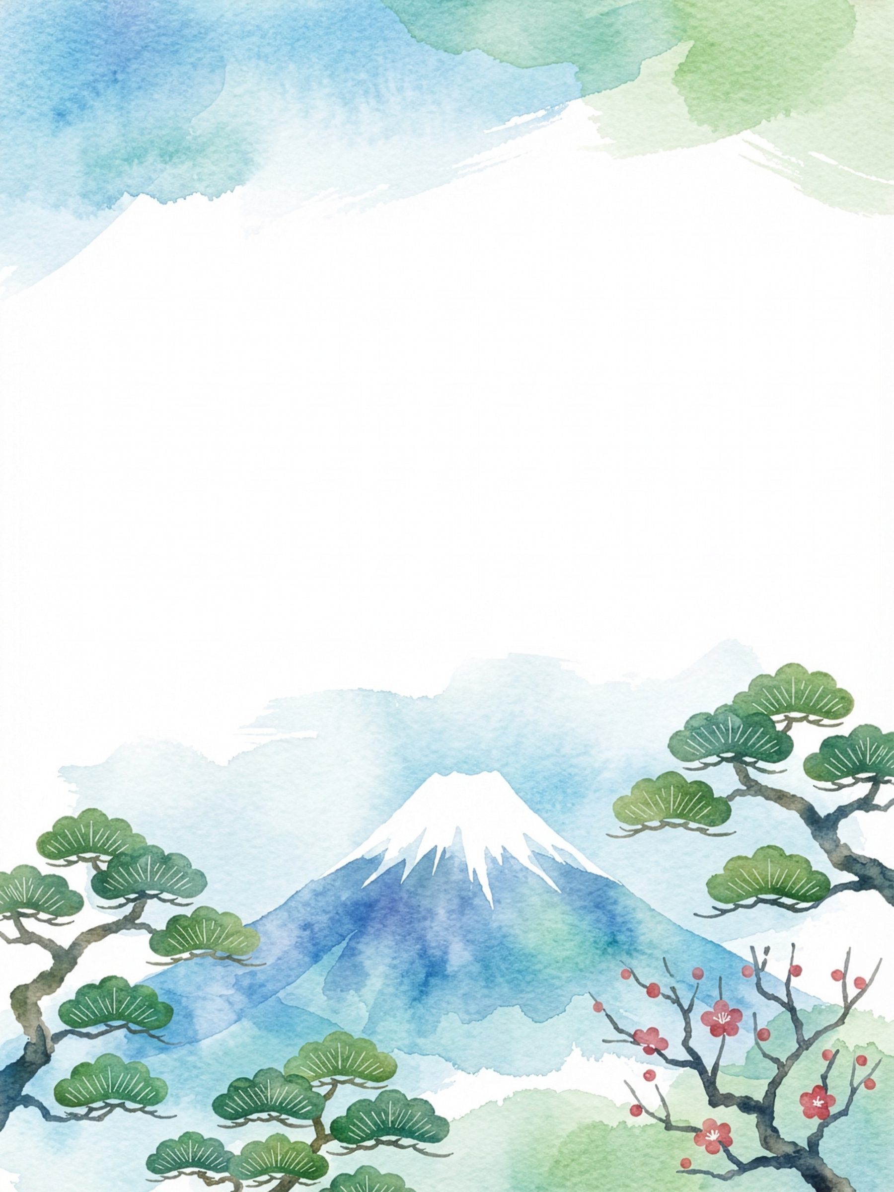 雄大な青い富士山を中央に据え、手前には力強い松と可愛らしい梅の花をあしらった、正統派の和風デザインです。美しい水彩タッチで描かれたこのイラストは、シワシワの紙のテクスチャを重ねることで、手漉き和紙のような温かみのある風合いを表現しています。お正月の年賀状デザインとしてはもちろん、インバウンド向けの和風メニューやポスターのバックグラウンドとしても最適です。商用OKかつ登録不要で、すぐにダウンロードしてご利用いただけます。日本の美しい風景を凝縮した一枚です。